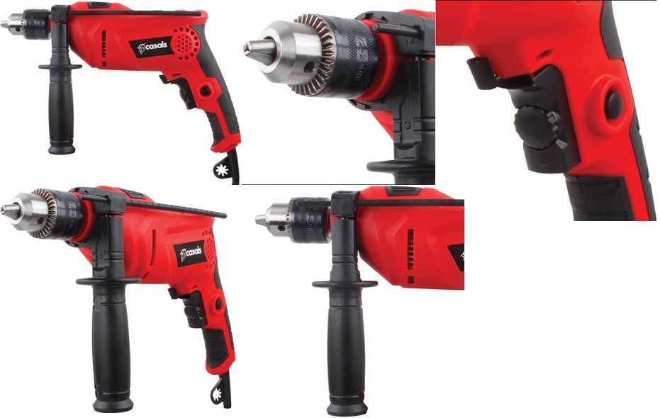Casals 13mm 810W Variable Speed Red Impact Drill – 810W Power, 13mm Keyed Chuck, Variable Speed Control, Hammer & Drill Function, Reverse Function, Tigger Lock Switch, 360° Adjustable Auxiliary Handle, 2m Power Cable, Retail Box, 6 Months Warranty
