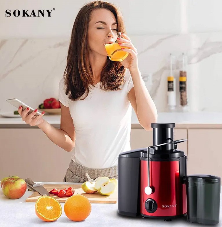 Sokany Powerful Electric Juicer – 800W Power Capacity, 2 Speed For Soft And Hard Fruits, Full Safety Lock, Easy Detachable Parts, Easy Wash And Dishwasher, Red Color, Retail Box, 6 Months Warranty.
